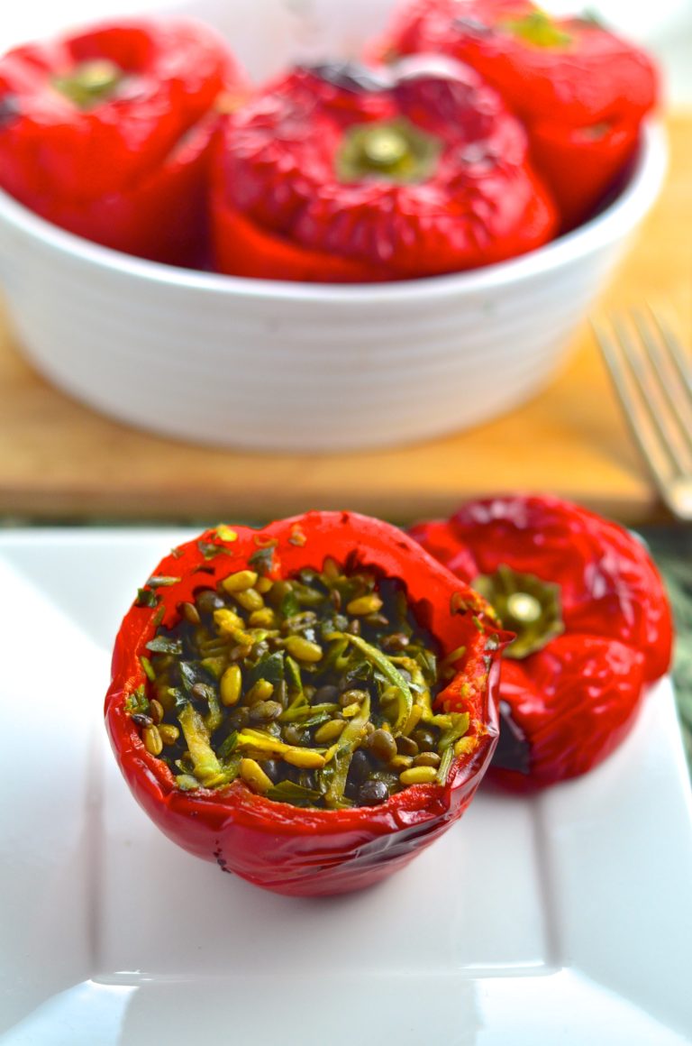 Poblano peppers are the vehicle for this healthy, exotic, and filling vegan main course. Lentils and quinoa give the filling a hearty and meaty texture.