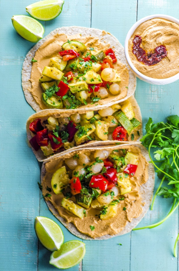 Get a head start on your Healthy Taco Tuesday and Cinco de Mayo prep with these vegan Chipotle Hummus And Roasted Vegetable Tacos! With a nice spicy kick from homemade chipotle hummus. Use your favorite tortillas and toppings to make them your own healthy tacos.