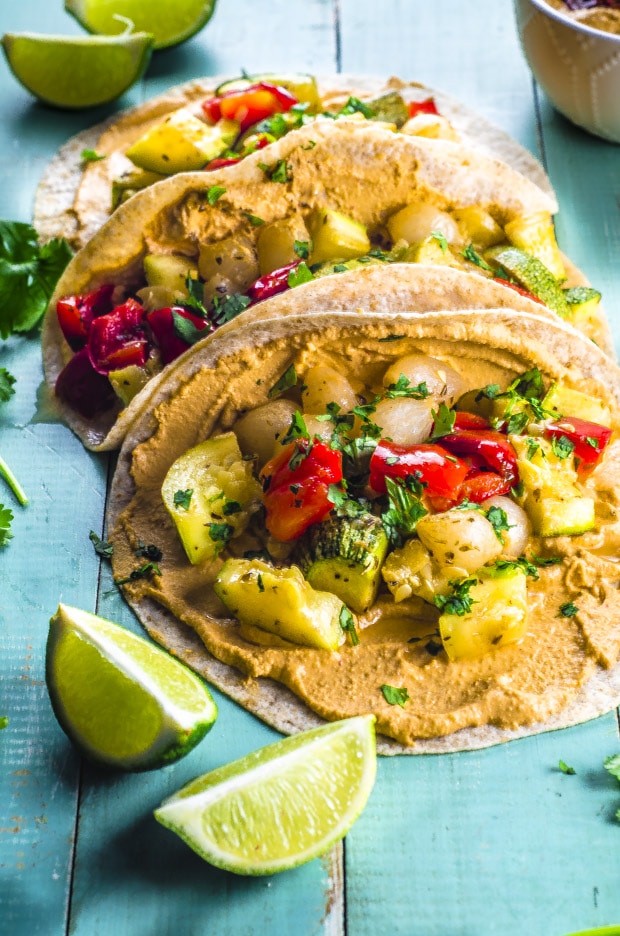 Get a head start on your Healthy Taco Tuesday and Cinco de Mayo prep with these vegan Chipotle Hummus And Roasted Vegetable Tacos! With a nice spicy kick from homemade chipotle hummus. Use your favorite tortillas and toppings to make them your own healthy tacos. Check out our other vegan dinner recipes under 300 calories