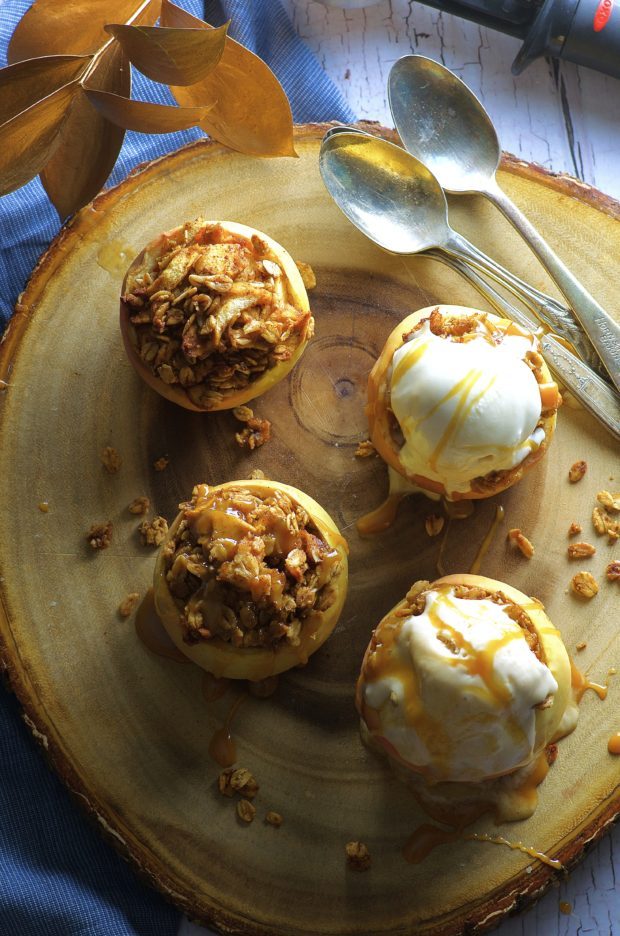 Take these super easy baked apples for example. They're sweet, but not loaded with sugar; they're crisp, they're warm... almost like a very apple-y apple pie, only easier and better for you. Now, you make these while you're preparing dinner, serve them as dessert with a little bit of your favorite ice cream ( Salted Caramel Cluster Cashew Ice Cream for us!!) and boom, you got dessert. Skip the ice cream and boom! Breakfast is ready.