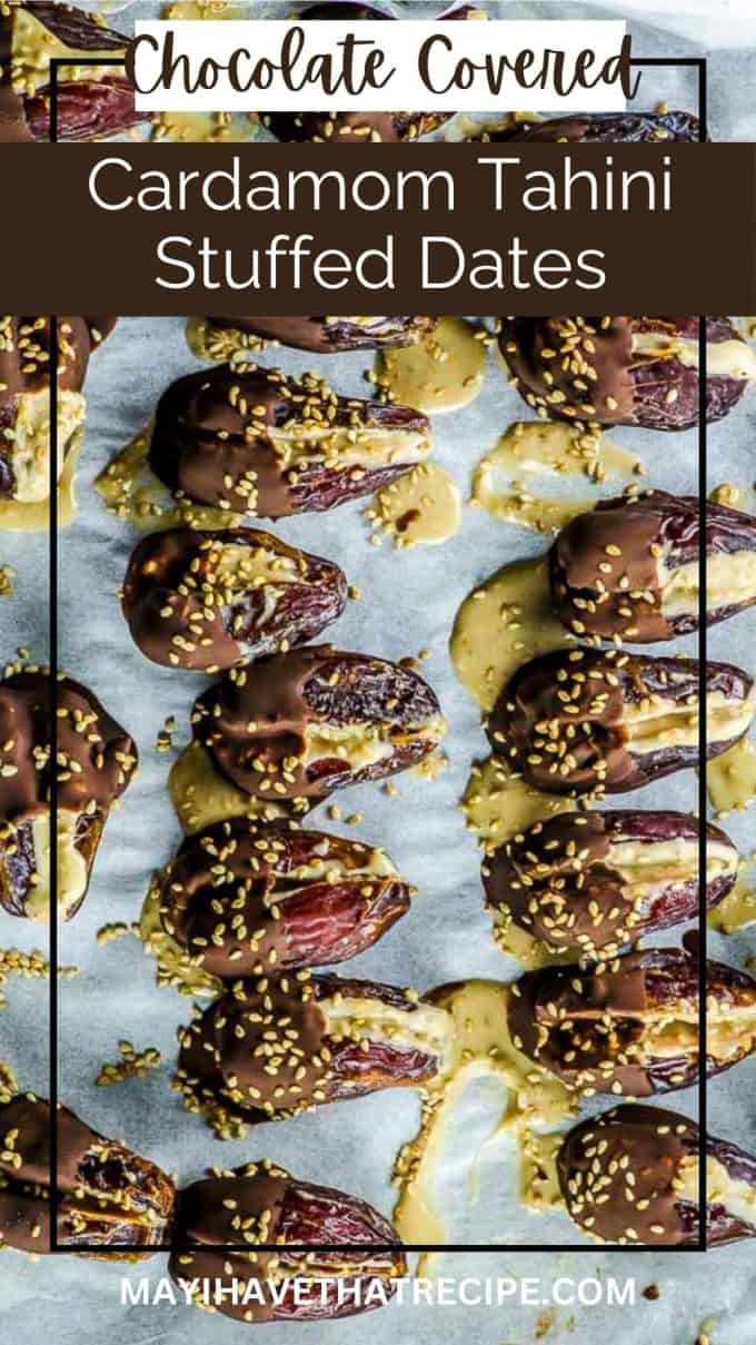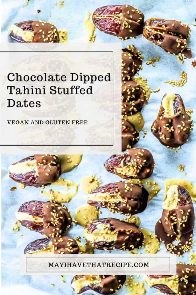 - Remove the dates from the freezer. Dip each date halfway through in the melted chocolate and place them back on the baking sheet. Sprinkle some sesame seeds over the chocolate and return to freezer until ready to eat