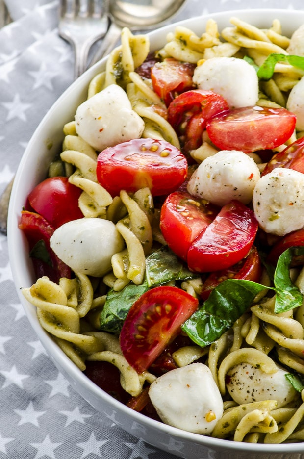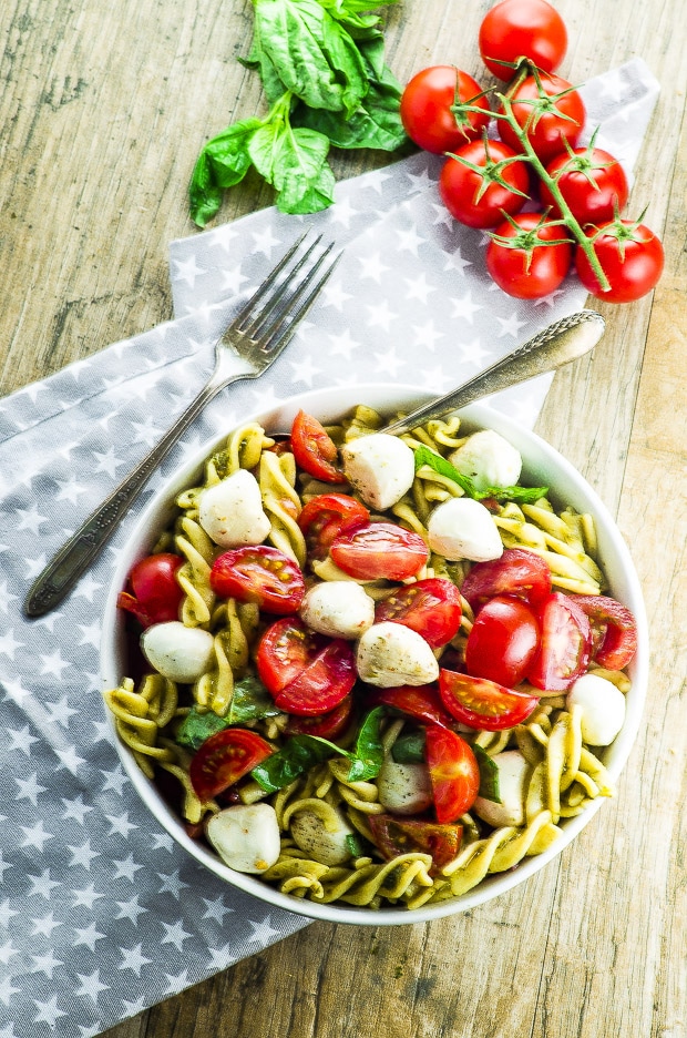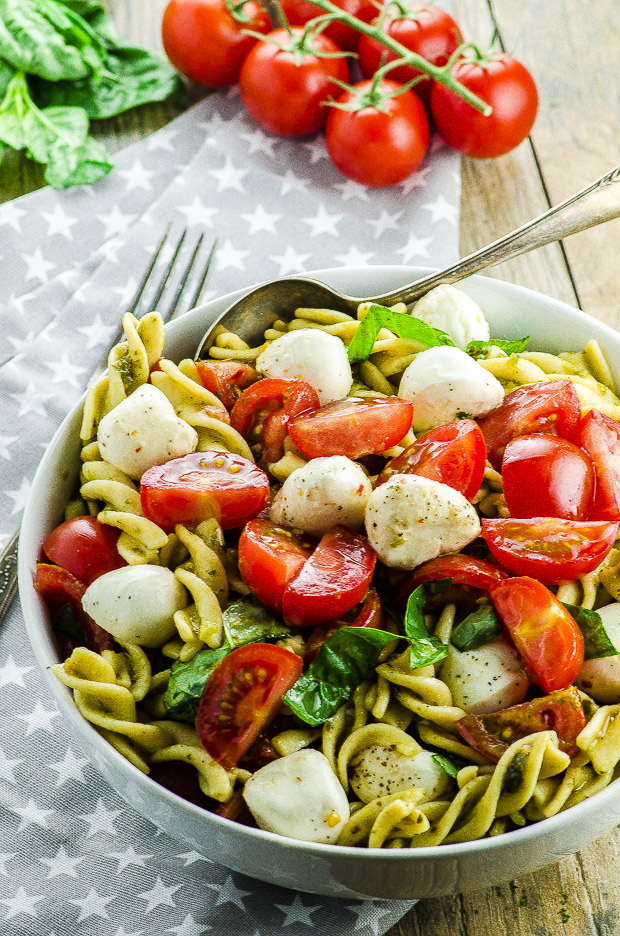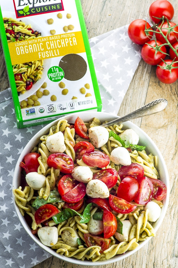 High Protein Caprese Pasta Salad - A light and fresh gluten free dish is full of protein and fiber, perfect for lunch or as a light dinner this summer! It can also be made Vegan!