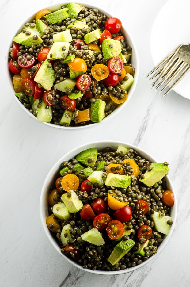 This avocado tomato and lentil salad is super delicious and filling!