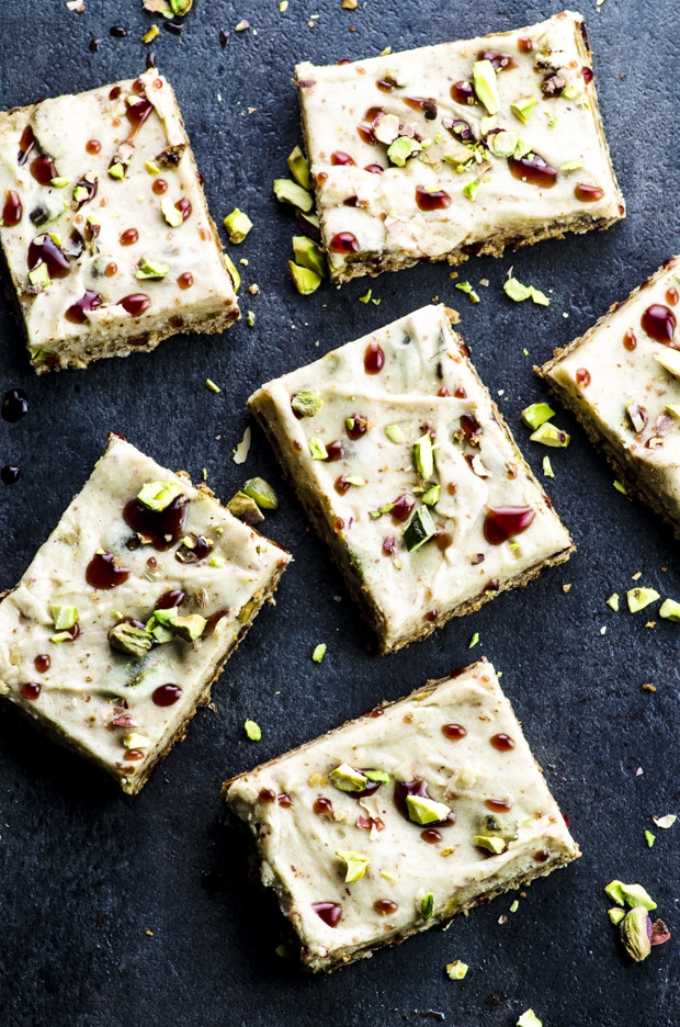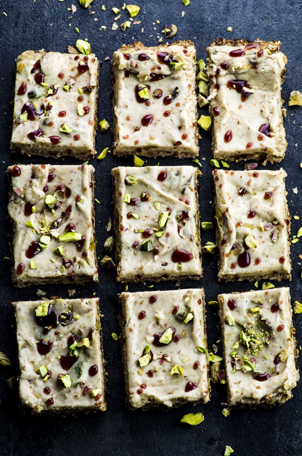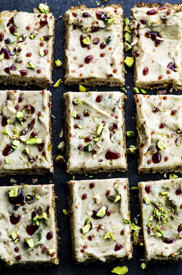 - Spread the filling over the cooled crust, sprinkle some chopped pistachios on top and refrigerate for at least 4 hours or overnight. Cut into bars and drizzle pomegranate molasses on top. Store in an airtight container in the refrigerator
