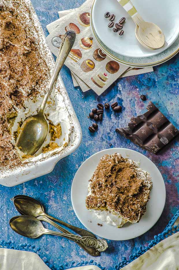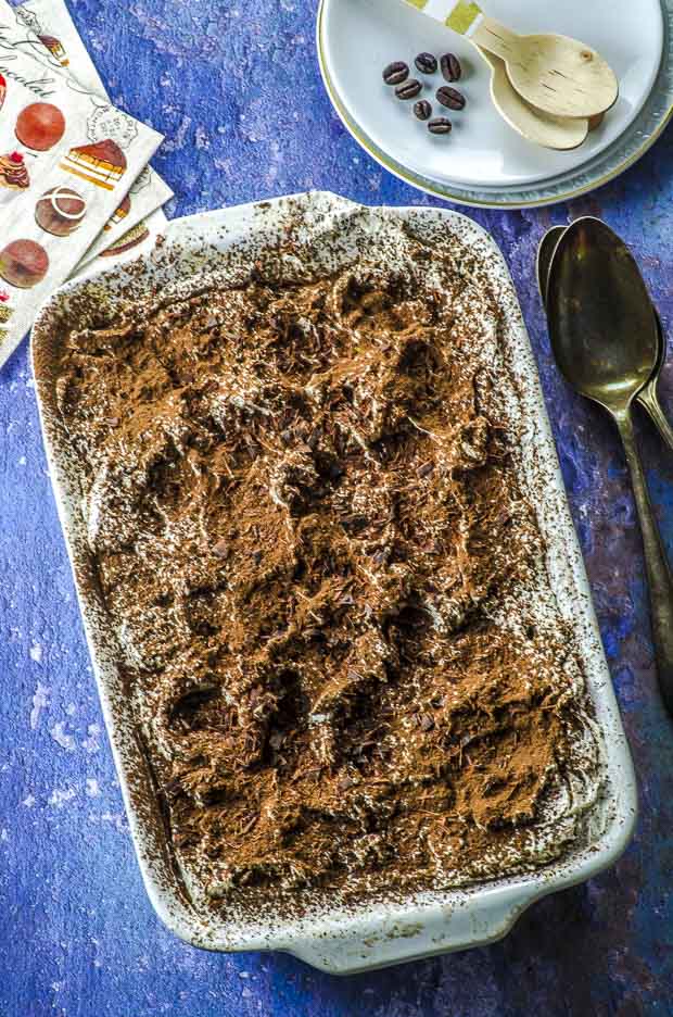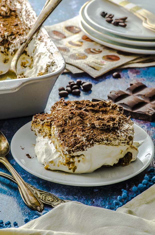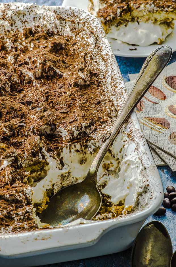 Vegan Tiramisu made with a homemade vegan sponge cake soaked in coffee, coconut whipped topping, and chocolate shavings. Simply irresistible. You don't feel like making your own vegan sponge cake? Just use ladyfingers!
